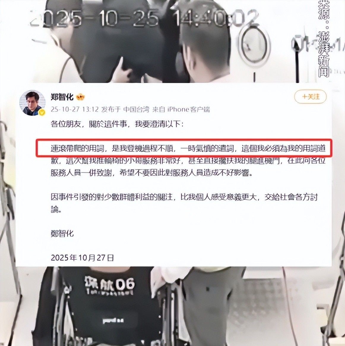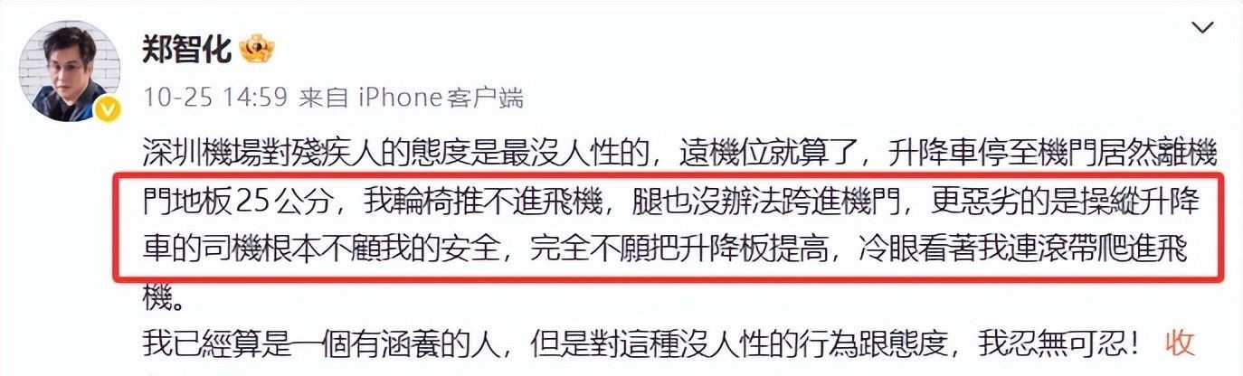 22. 更令人唏嘘的是,郑智化在27日发布的道歉声明中态度大变,称赞当初被他指责的地勤人员:“推轮椅的小哥服务非常到位,还主动弯腰协助我进舱。”